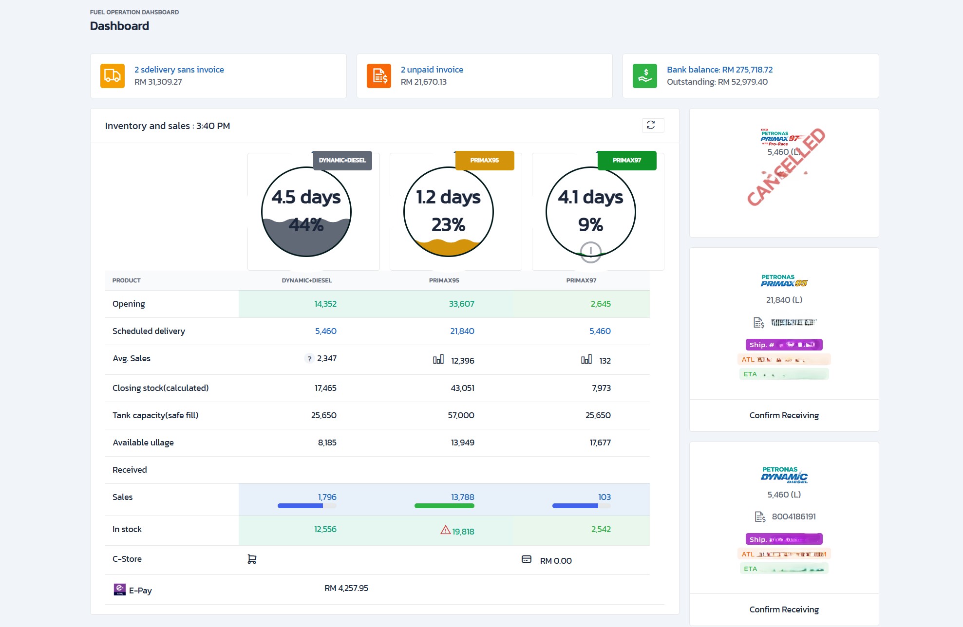 • - Stock and tank ullage overview